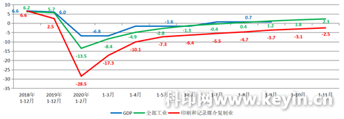2020年新冠肺炎疫情對(duì)經(jīng)濟(jì)的影響巨大。根據(jù)國(guó)家統(tǒng)計(jì)局的數(shù)字顯示,一季度國(guó)內(nèi)生產(chǎn)總值同比下降6.8%,二季度增長(zhǎng)3.2%,對(duì)比往年,下降嚴(yán)重,但對(duì)比全球,中國(guó)是疫情爆發(fā)以來(lái)首個(gè)實(shí)現(xiàn)增長(zhǎng)的主要經(jīng)濟(jì)體。 上圖反映了新冠疫情,對(duì)中國(guó)經(jīng)濟(jì)、對(duì)印刷產(chǎn)業(yè)造成了嚴(yán)重的影響。新冠疫情初起的時(shí)候,全國(guó)經(jīng)濟(jì)按下了暫停鍵。1-2月,無(wú)論GDP、全部工業(yè),還是印刷行業(yè),都出現(xiàn)了巨大降幅,這是近10多年不曾出現(xiàn)的景象。